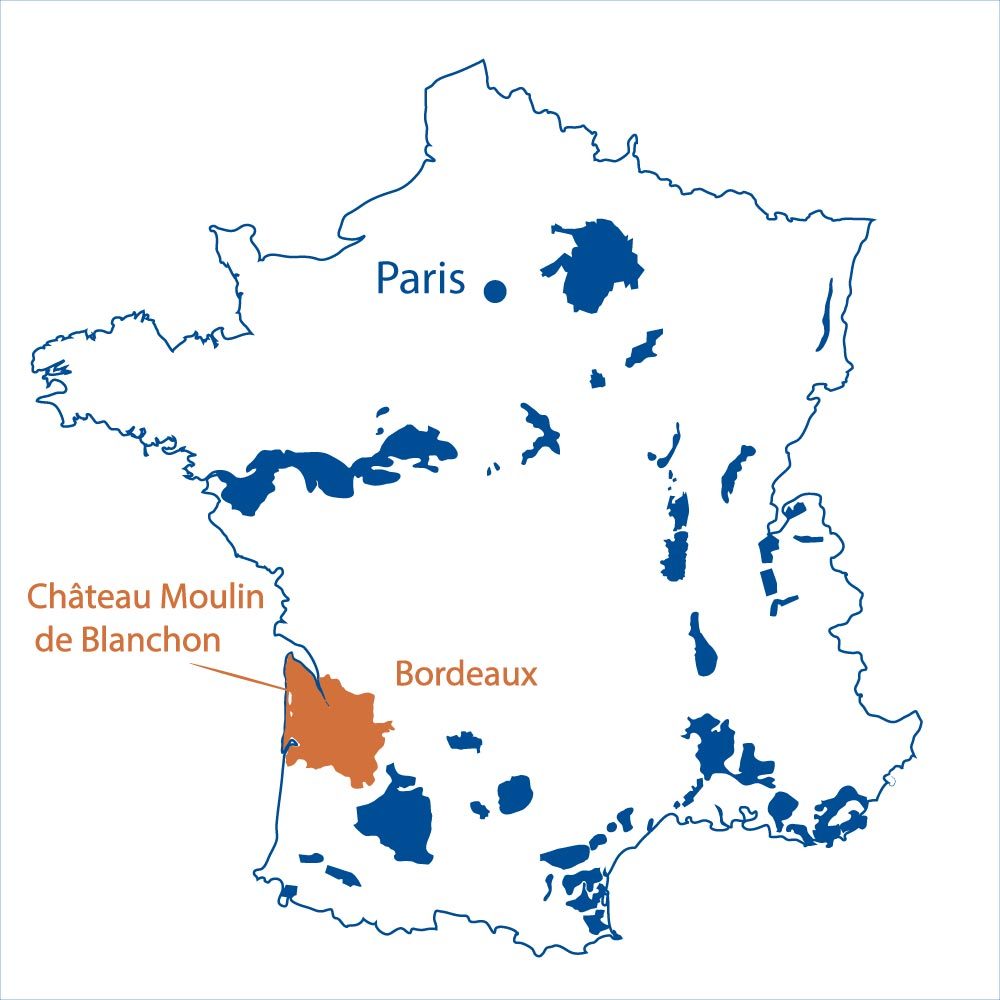 Saint-Seurin-de-Cadourne | BordeauxChâteau Moulin de Blanchon is a quality-oriented family estate is located in the village of Saint-Seurin-de-Cadourne, just north of Saint-Estèphe and perfectly exposed to the cooling influence of the Gironde estuary. This ideal location allows the Negrier family to craft a Bordeaux blend that retains a tension and freshness regardless of the season’s caprices, a red that always satisfies.